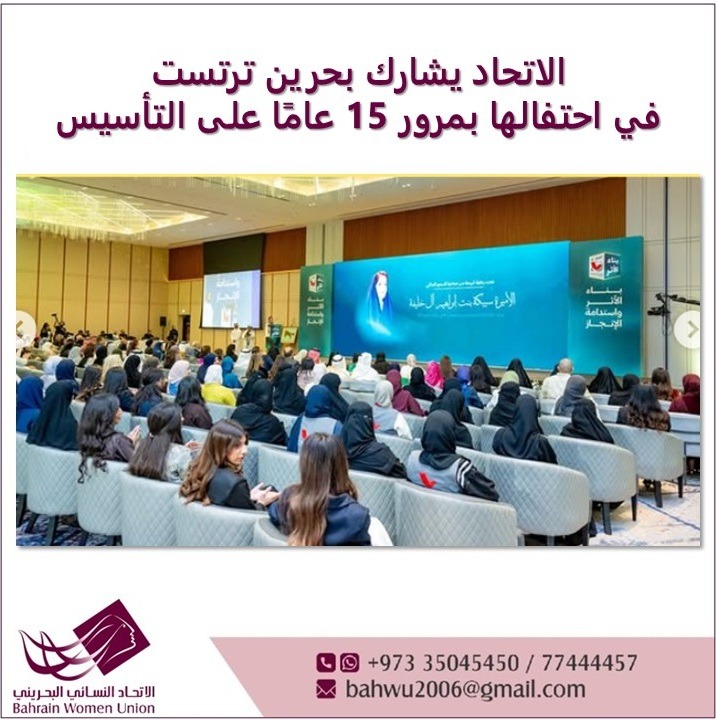 شاركت الاستاذة أنيسة الرويعي نائبة رئيسة الاتحاد النسائي البحريني في حفل نظمته مؤسسة بحرين ترست تحت رعاية كريمة من صاحبة السمو الملكي الأميرة سبيكة بنت ابراهيم آل خليفة قرينة جلالة الملك المعظم رئيسة المجلس الاعلى للمرأة حفظها الله ، بمناسبة مرور خمسة عشر عامُا على تأسيس المؤسسة ، وذلك يوم الثلاثاء الموافق ٢٥ نوفمبر ٢٠٢٥ في فندق الشيرتون .