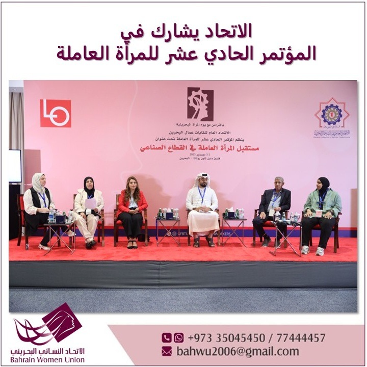 حضر وفد من الاتحاد النسائي البحريني يتكون من د. سمية الجودر رئيسة الاتحاد و أ. رملة جواد الأمين المالي وأ. عفرة سرور عضوة مجلس الإدارة، مؤتمر المرأة العاملة الحادي عشر، والذي نظمه الاتحاد العام لنقابات عمال البحرين بالتعاون مع اتحاد عمال النرويج، تحت عنوان (مستقبل المرأة العاملة في القطاع الصناعي) في 2 و3 ديسمبر 2025م.