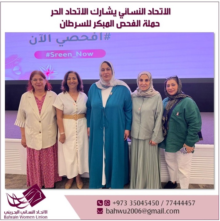 A delegation from the Bahrain Women Union, consisting of Ms. Ahlam Rajab, President of the Union, Ms. Farida Darwish, Vice President, Ms. Rawaa Al Sheikh, Financial Secretary, and Board Members Ms. Iman Al Asfour and Dr. Maryam Al Shatti, attended the launch of the early breast cancer screening campaign on Wednesday morning, October 1st, which was organized by the Bahrain Free Trade Union Federation, at the Bapco Club Hall in Awali.